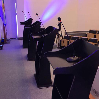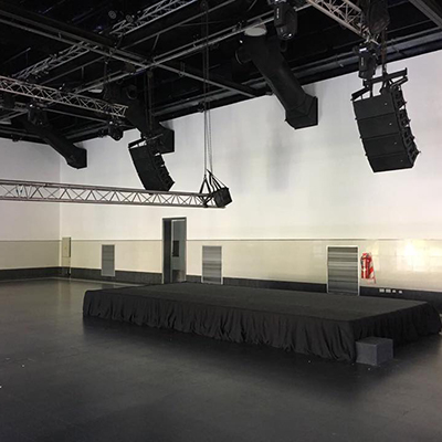 Servicio de alquiler de escenario 4x3 metros alfombrado con atriles negros.